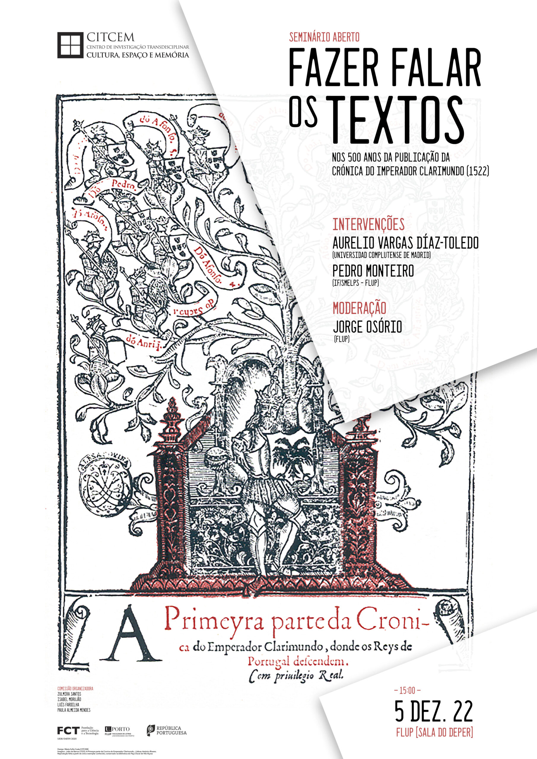 Aurélio Vargas Díaz-Toledo (U. Completense de Madrid) e Pedro Monteiro (FLUP), com moderação de Jorge Osório (FLUP), explorarão os “500 Anos da Publicação da Crónica do Imperador Clarimundo (1522)”, no âmbito do seminário aberto «Fazer Falar os Textos».